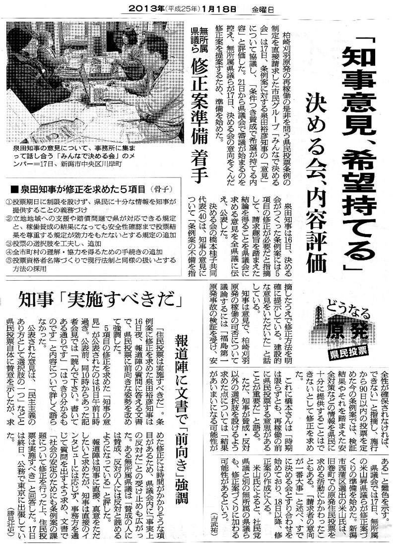 2013/1/18 朝日新聞 「知事意見、希望持てる」