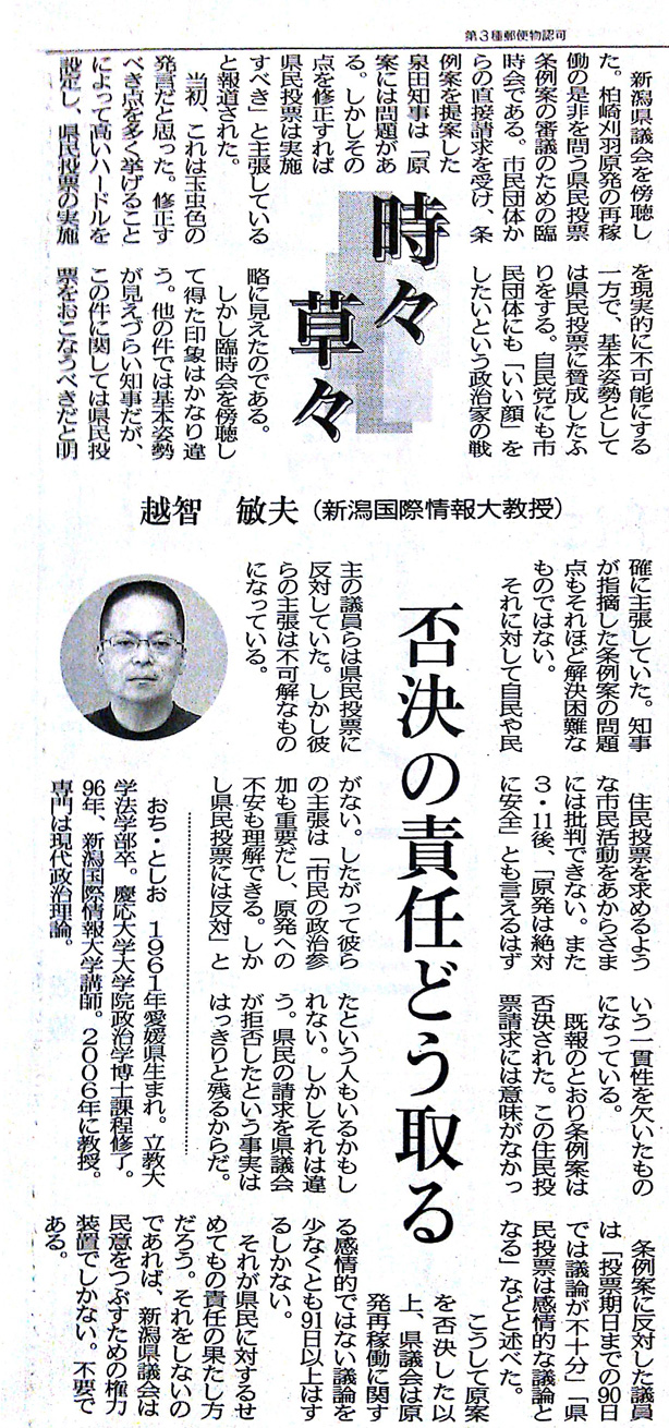 1月26日(土)新潟日報 越智敏夫氏論説