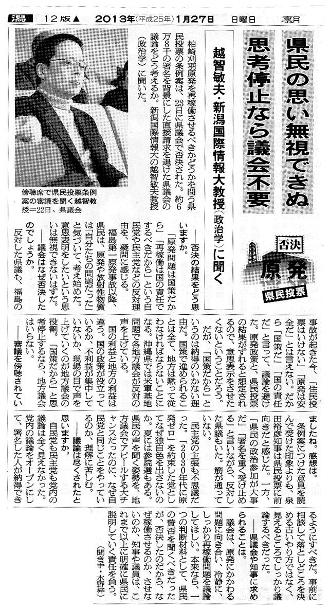 1/27(日)朝日新聞 越智敏夫氏へのインタビュー