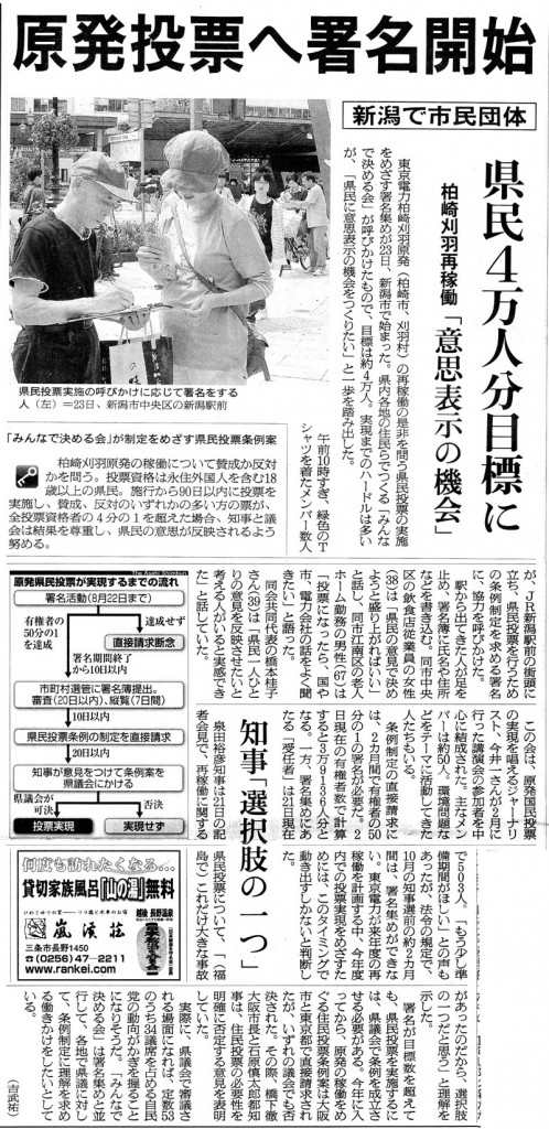 街頭署名活動の様子と泉田知事のコメントが後半に書かれています。